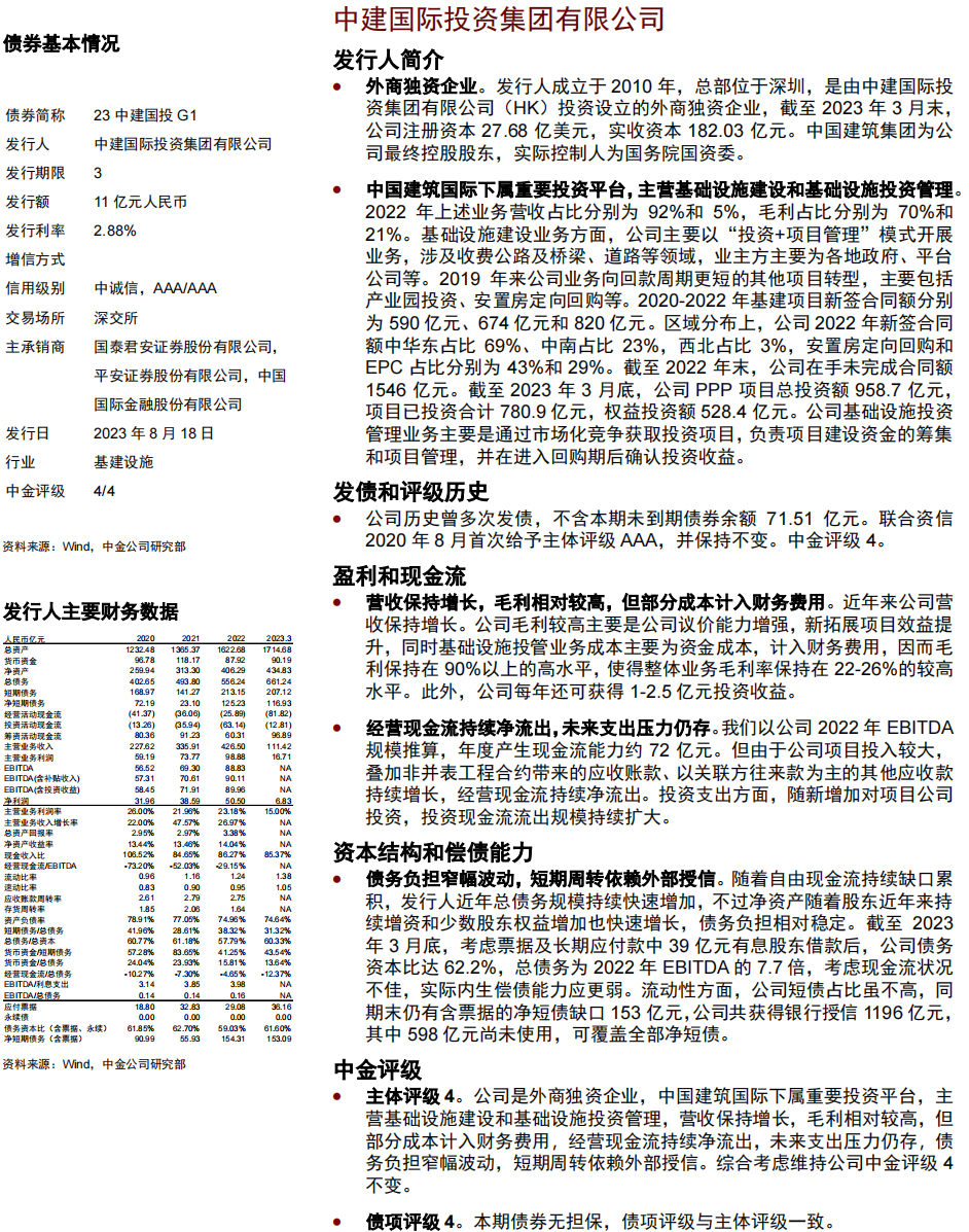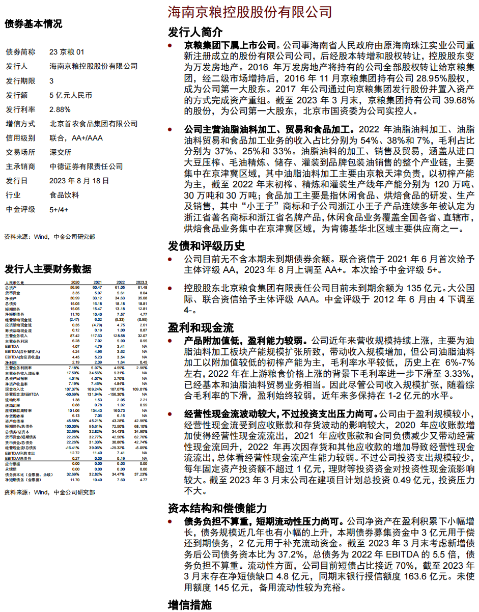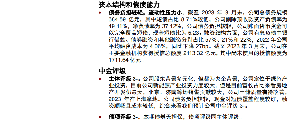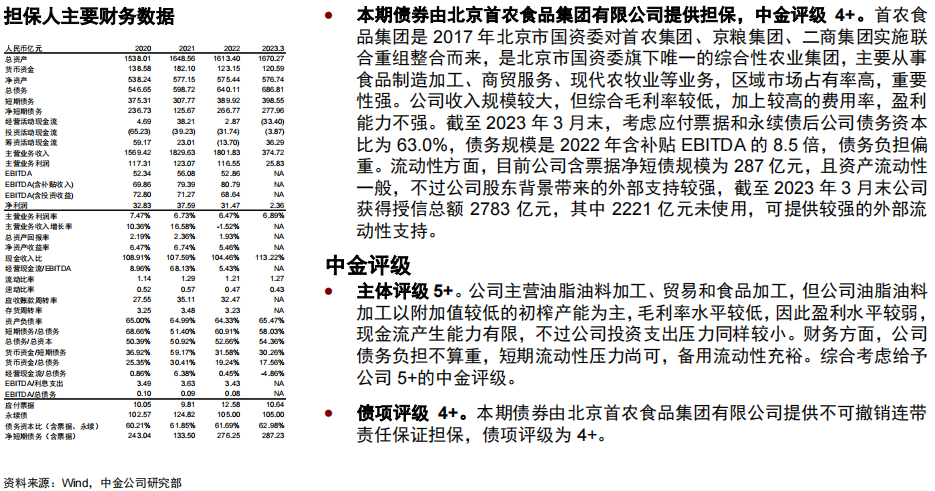 •债项方面,23京粮01、23青租03分别由北京首农食品集团有限公司、青岛城市建设投资(集团)有限责任公司提供担保,担保人中金评级分别为4+和3-,债项评级同担保人中金评级。23安租Y4、凯盛YK05/06为可续期公司债,在破产清算时的清偿顺序劣后于发行人普通债务,考虑到发行人信用资质一般,债项评级分别由主体评级下调一小档至4和4-。