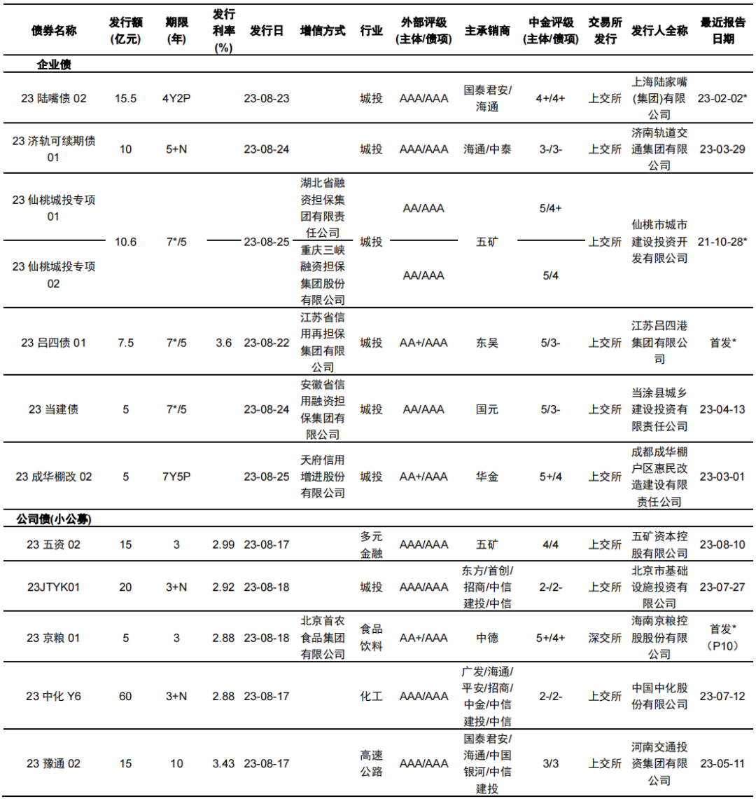 本期报告覆盖了近一周发行的公募公司债和企业债,其中距离上次跟踪超过六个月的发行人有详细点评。