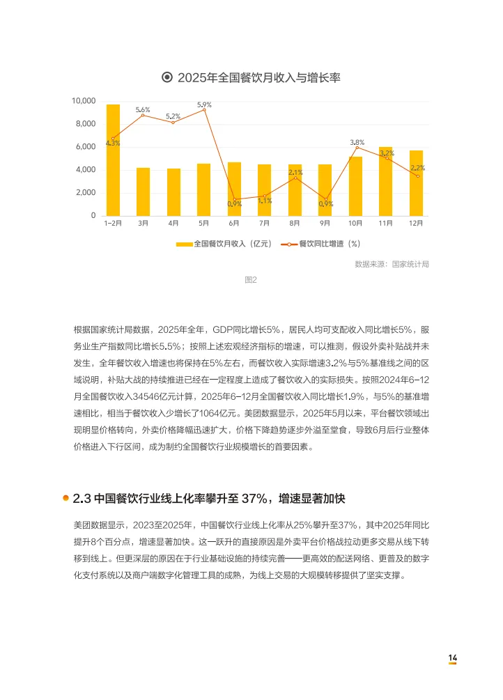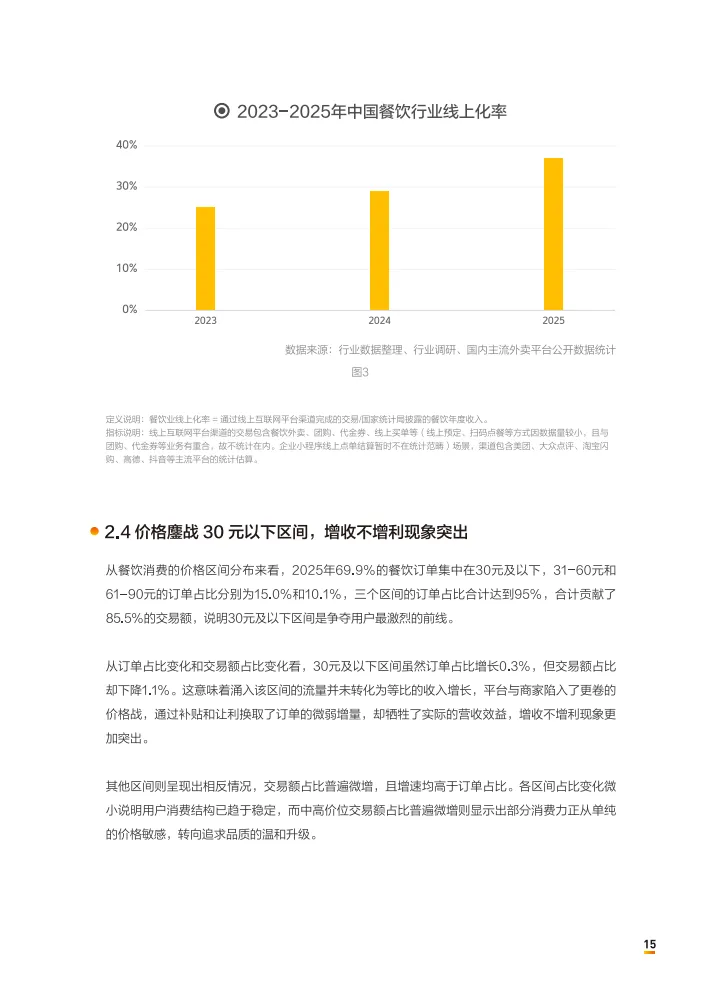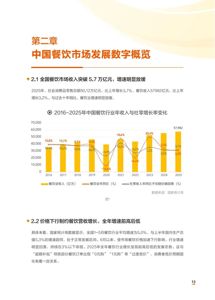 2025年中国餐饮行业迈入理性消费与高质量发展新阶段,市场规模突破5.7万亿元,增速放缓至3.2%,呈现前高后低态势。价格内卷集中在30元以下消费区间,行业普遍增收不增利,线上化率攀升至37%,数字化成为行业发展重要支撑。