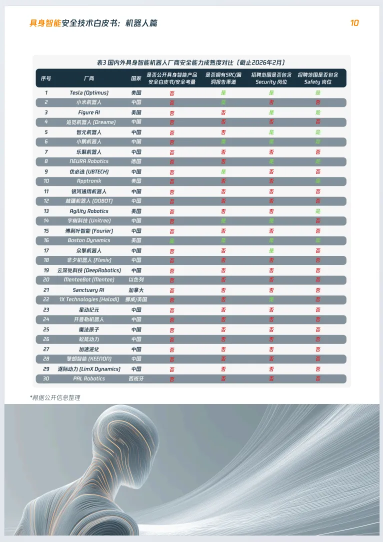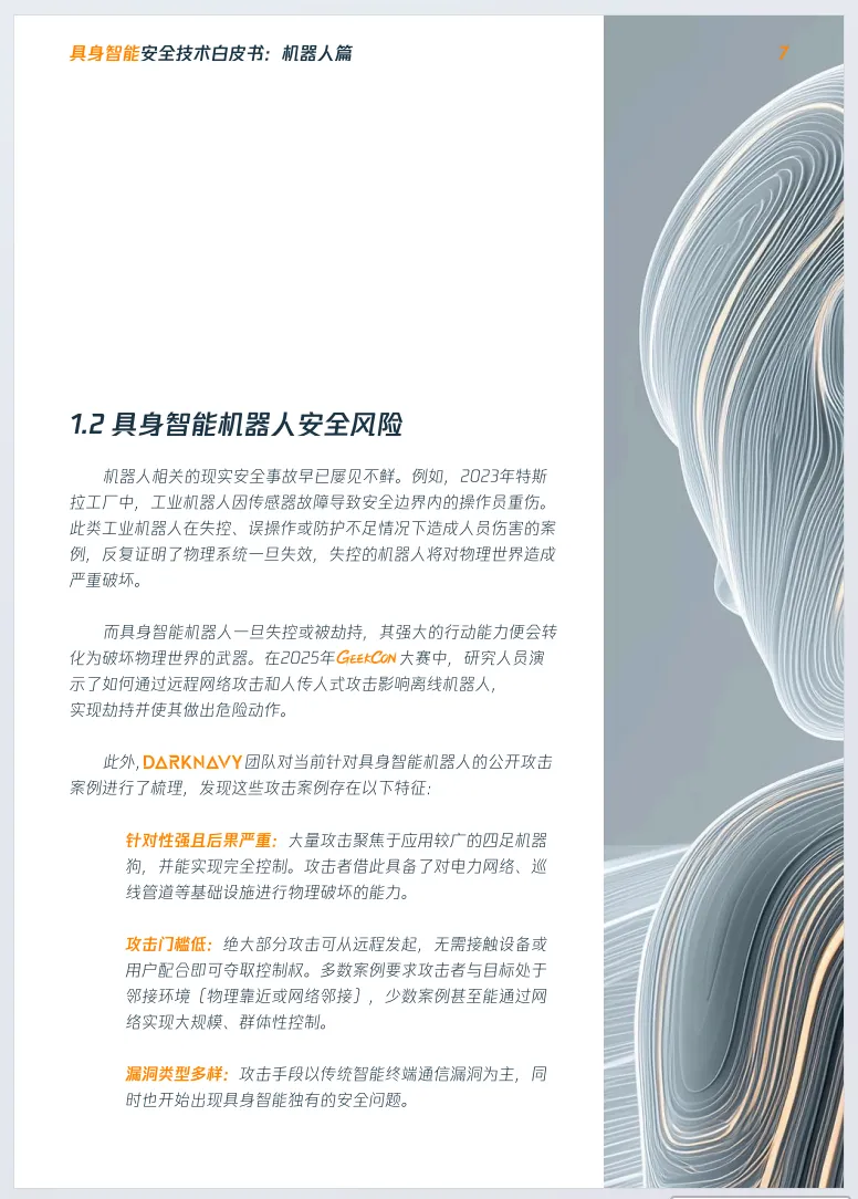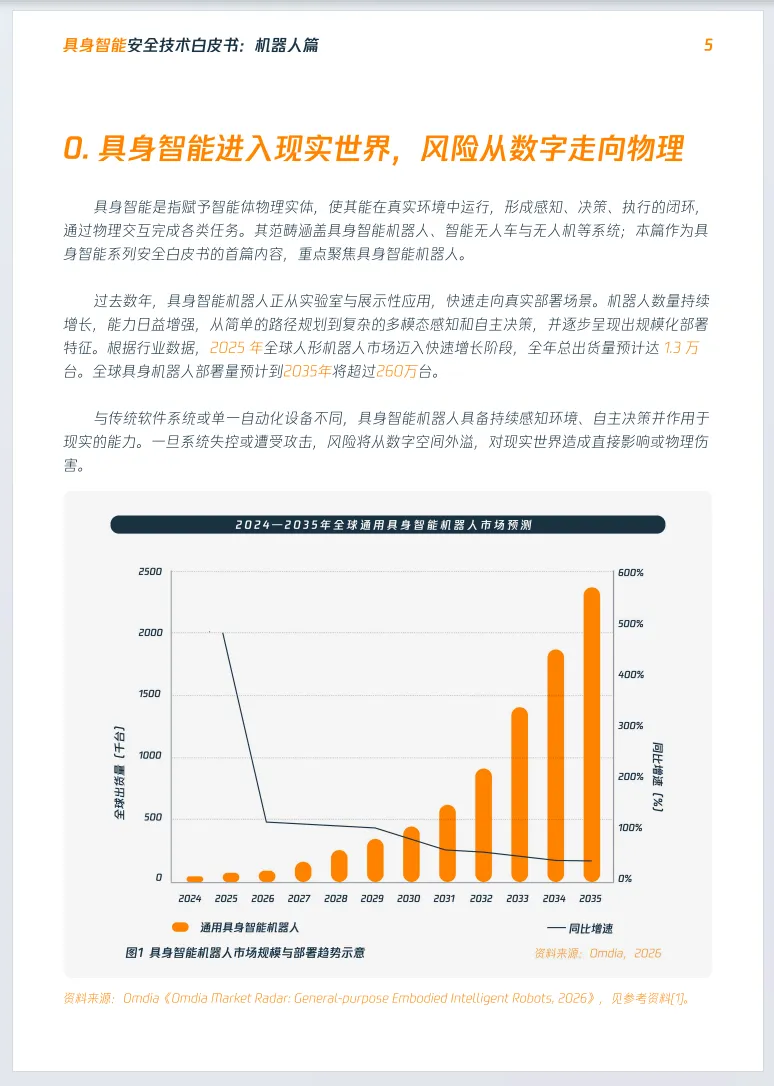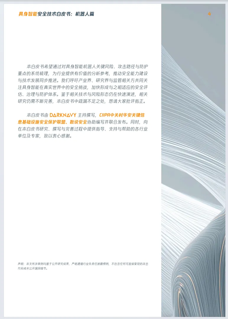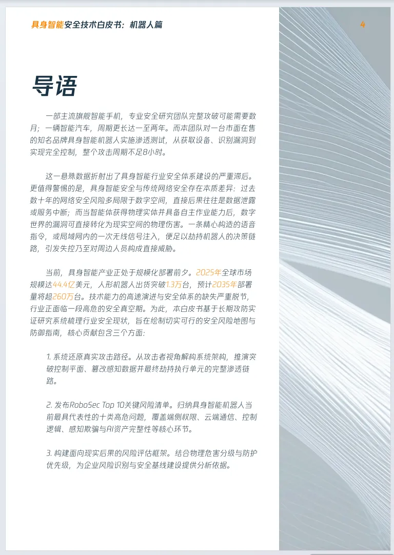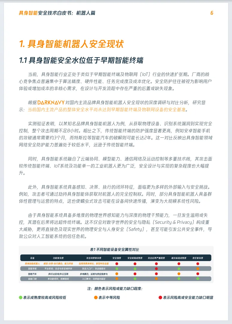 《2026年具身智能安全技术白皮书:机器人篇》由数说安全、CIIPA中关村华安关键信息基础设施安全保护联盟联合发布,聚焦具身智能机器人安全,揭示行业处于高危安全真空期,安全水位远低于早期智能终端,知名机器人可在8小时内被完全控制。