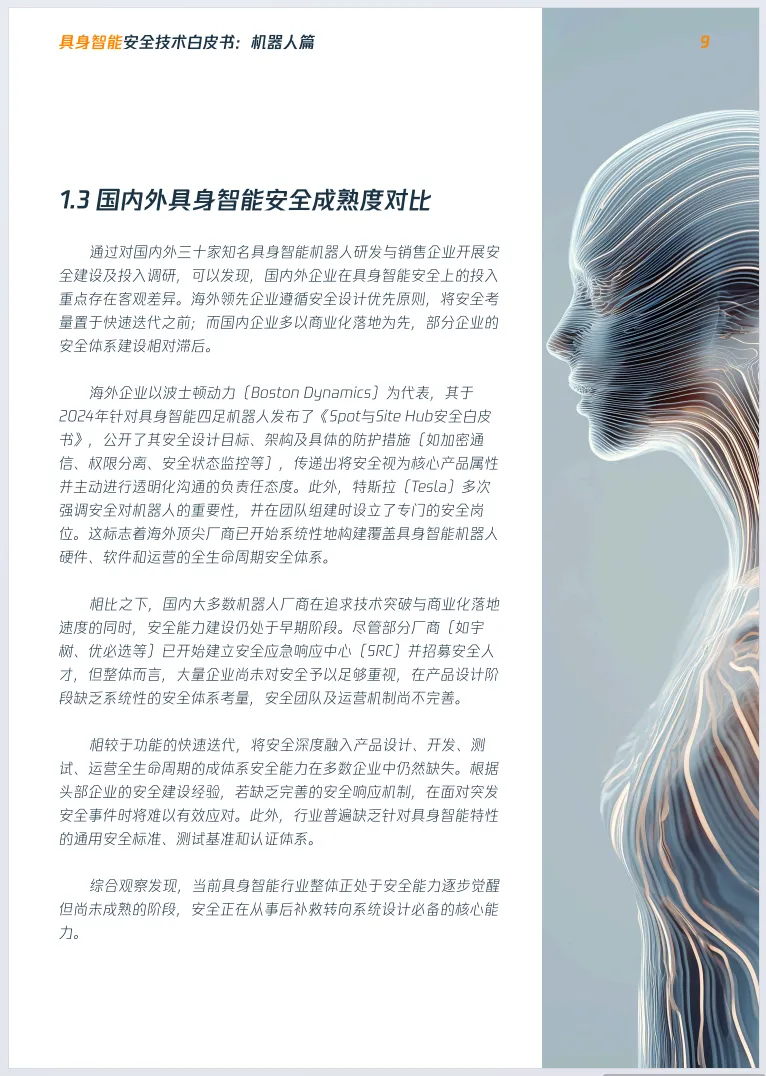构 L1-L五级安全影响分级,发布RoboSec Top 10关键风险清单,拆解AI决策欺骗等三类典型攻击路径。对比国内外安全成熟度,海外企业安全设计优先,国内多数厂商安全建设滞后。展望行业将进入安全能力关键建设期,安全机器人需具备抗攻击、物理安全、隐私保护三维能力,未来将向安全设计前置、标准体系完善等方向发展。
