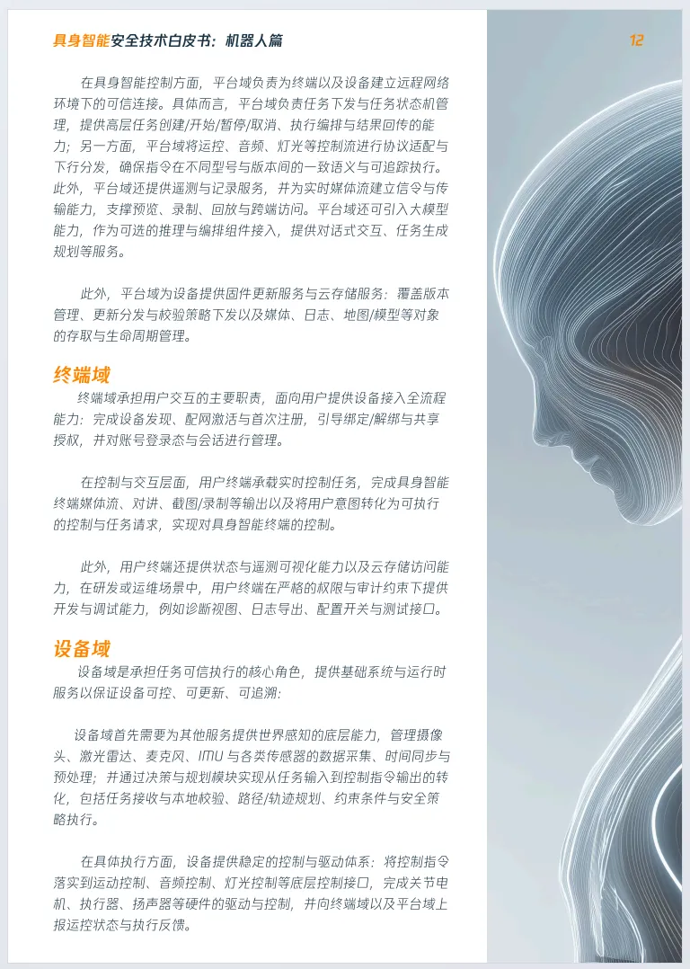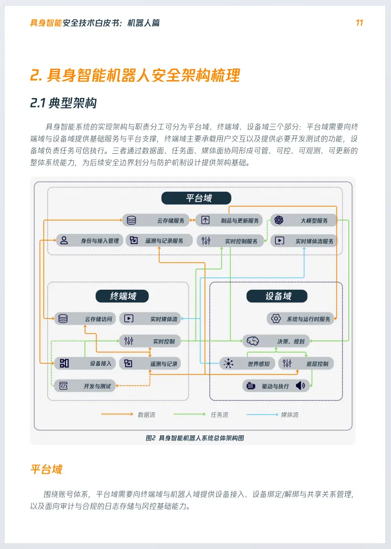 报告明确具身智能安全风险从数字空间外溢至物理世界,可引发人身伤害等现实危害;梳理平台域、终端域、设备域三层架构,提出行为可约束等四大安全目标,归纳云端未授权访问等七类典型攻击场景。