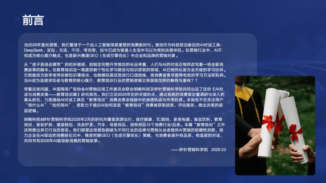 2026年初,AI对话工具已全面融入大众生活,成为消费决策重要辅助。明略科技、秒针营销科学院联合发布的教育培训行业报告,基于全国1000名AI用户调研,揭示AI在教育培训消费决策中的渗透现状、作用机制与用户态度,为行业GEO策略提供数据支撑。