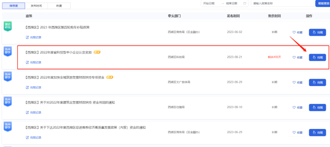 3. 按发布时间排序,找到【西湖区】2022年度省科技型中小企业认定奖励,点击兑现