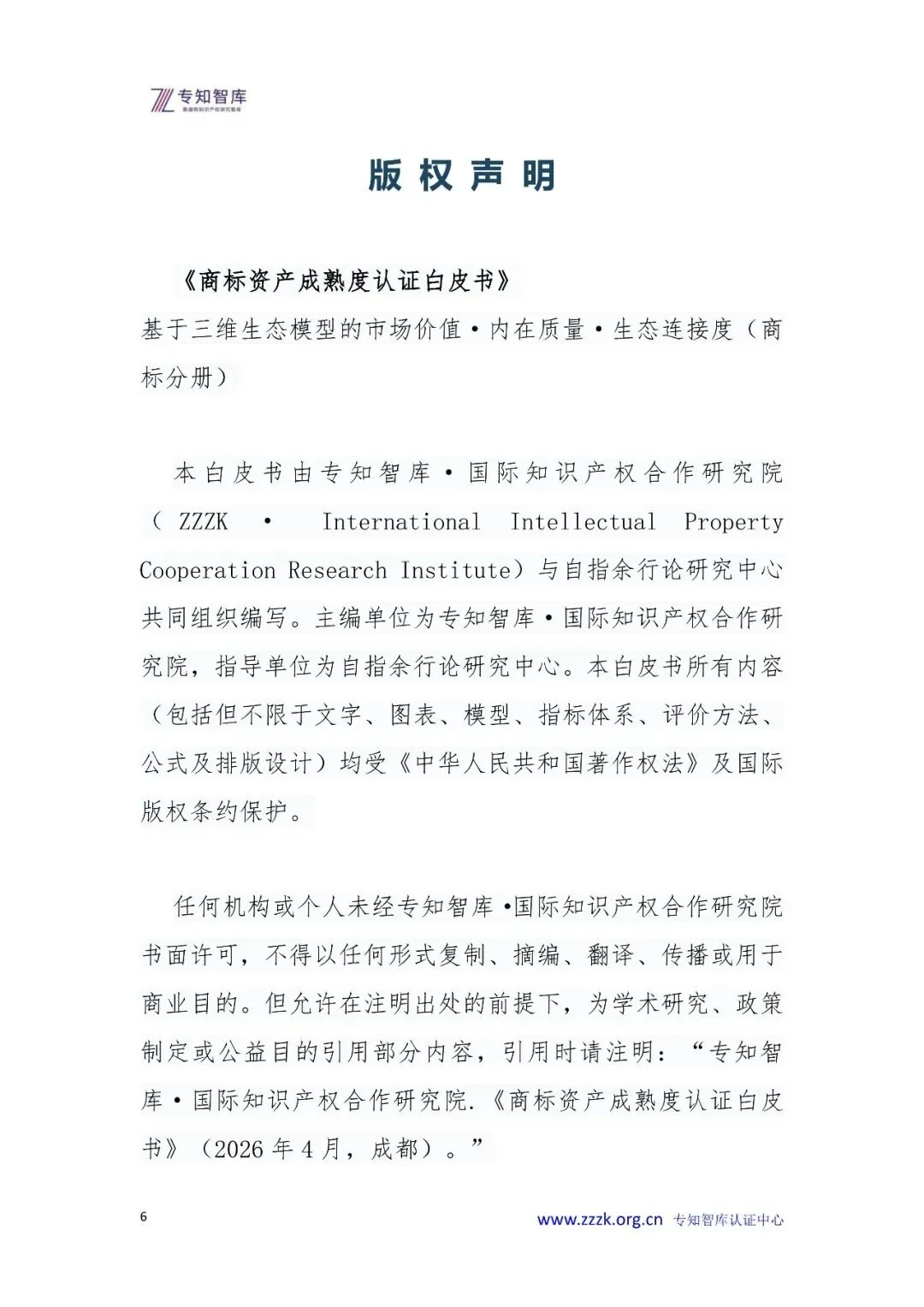 专知智库于2026年4月发布了《知识产权资产成熟度认证白皮书》(总纲),确立了以市场价值、内在质量、生态连接度为核心的三维生态模型,以及L1-L5五级成熟度等级,为专利、商标、数据知识产权、意义产权等各类无形资产提供了统一的评价框架。本分册《商标资产成熟度认证白皮书》是总纲在商标领域的具体化与深化,旨在将三维生态模型的通用指标细化为商标特有的二级、三级指标,并结合商标注册、使用、续展、许可、转让、维权、驰名认定等特有场景,为企业、商标代理机构、金融机构和政府部门提供一套可操作、可验证、可对标的商标资产成熟度认证工具。