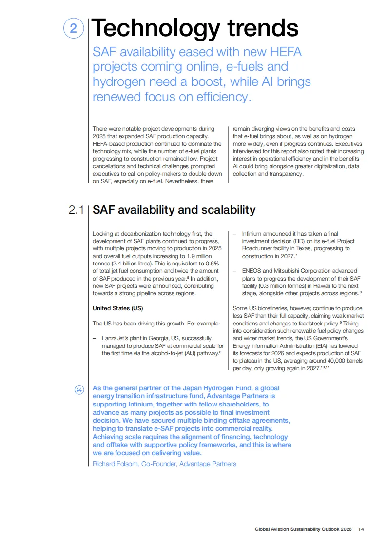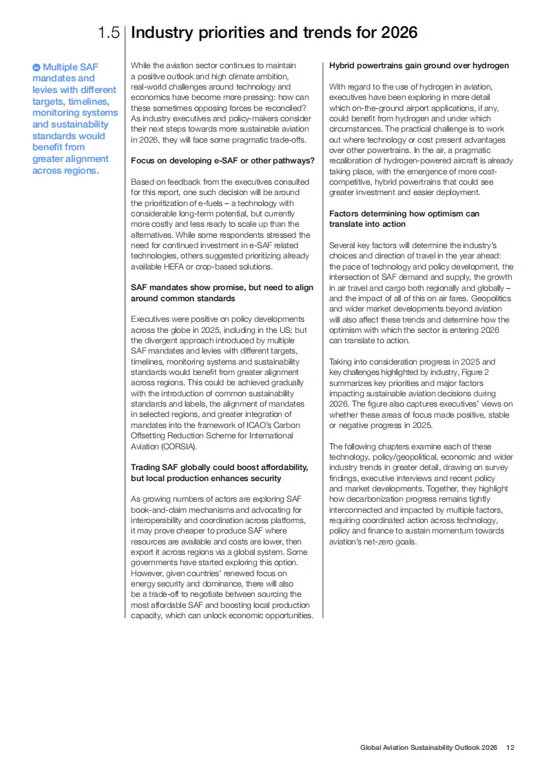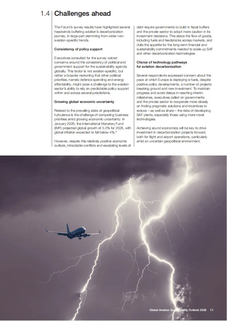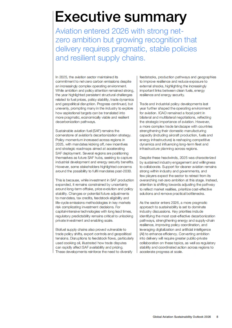 这份《2026年全球航空可持续发展展望白皮书》核心呈现了航空业在坚守2050净零目标的前提下,转向务实推进可持续转型的整体态势,行业在增长与减碳的平衡中,面临技术、政策、经济与运营的多重挑战。