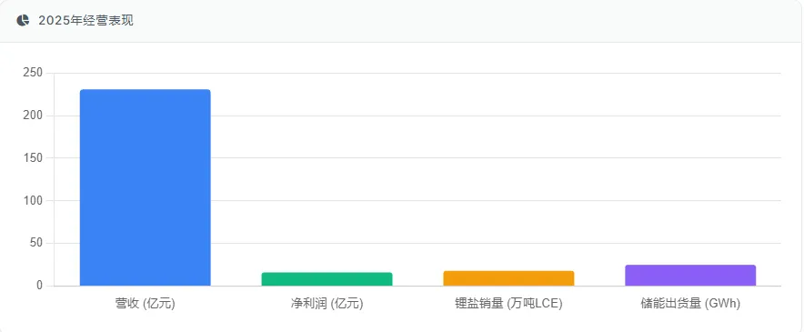 经营表现:2025年,公司实现营收230.82亿元,同比增长22.08%,净利润16.13亿元,同比增长177.77%,成功扭亏为盈。全年锂盐销量达18万吨LCE,储能系统出货量突破25GWh,固态电池领域实现从材料到电芯的全链路布局。