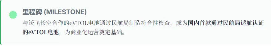 •2025年7月,与沃飞长空合作的320Wh/kg eVTOL电池通过民航局制造符合性检查,12月完成第一阶段载人试飞