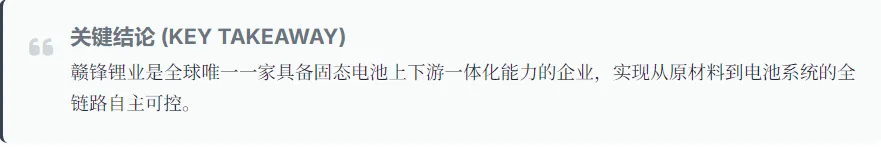 赣锋锂业在固态电池材料端已实现关键突破,特别是在硫化锂的量产能力与纯度指标上,处于全球领先地位。