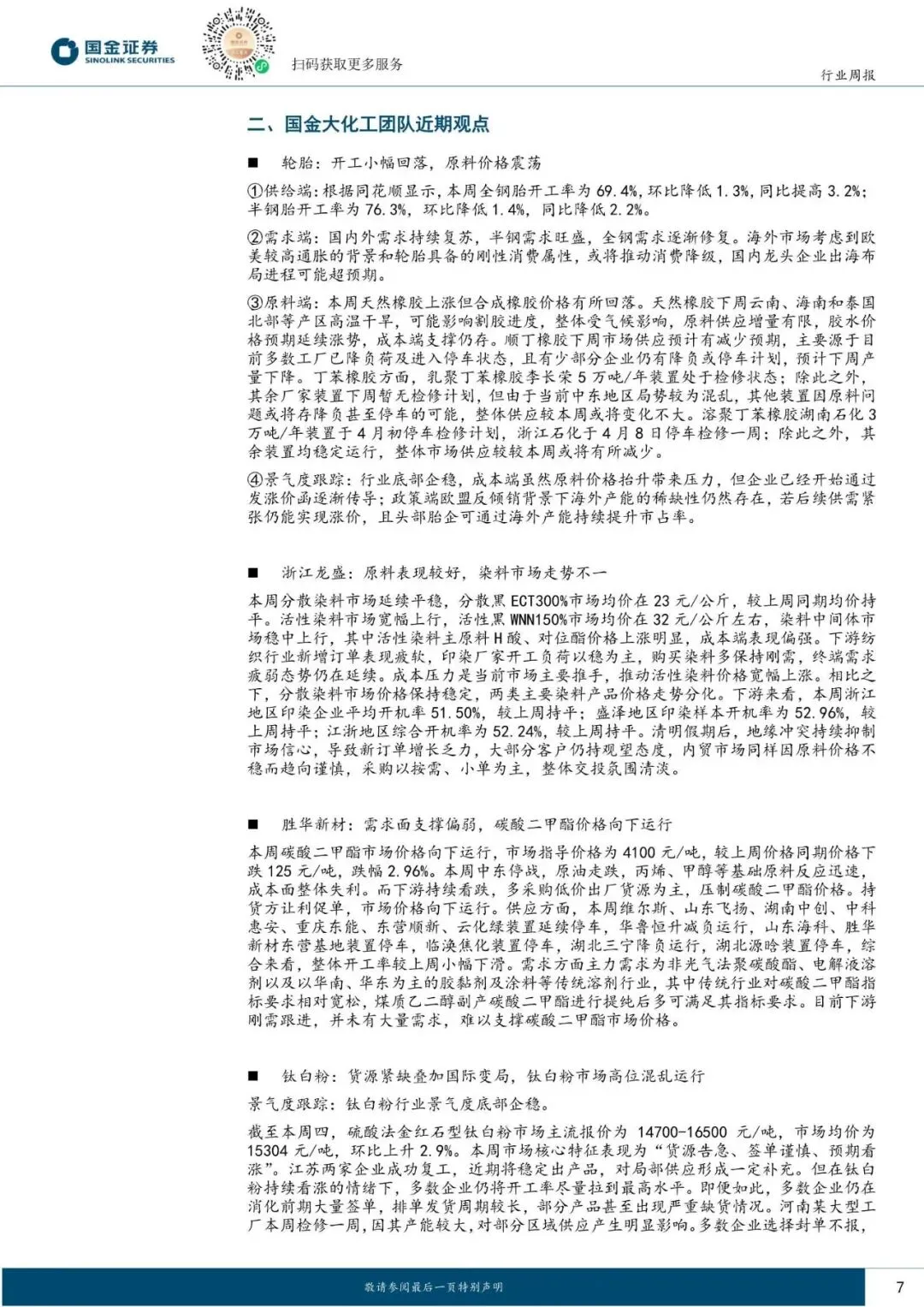化工行业边际变化,主要建议关注两大事件,一是本周染料产业链价格上行,包括活性染料、H 酸,二是美国公布对华 MDI 反倾销调查终裁结果,相较初裁倾销率大幅下调。
