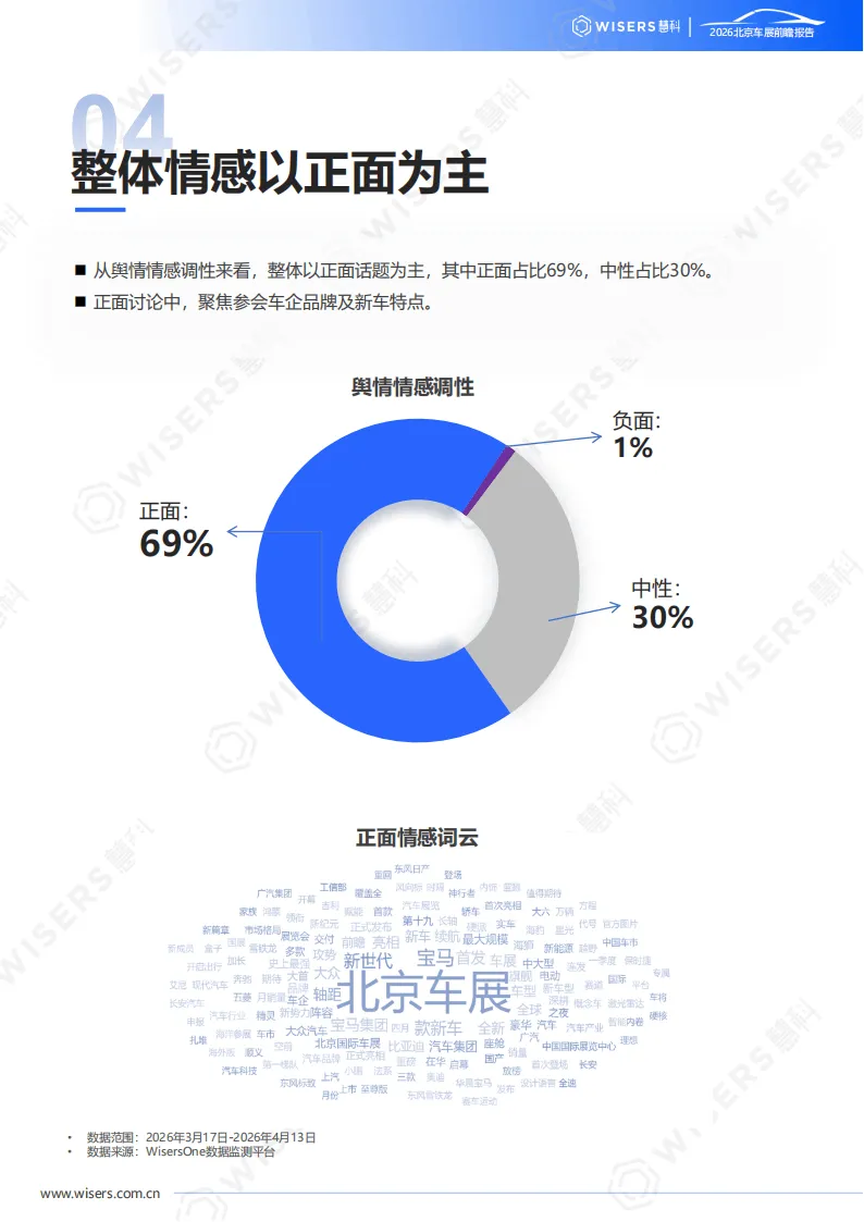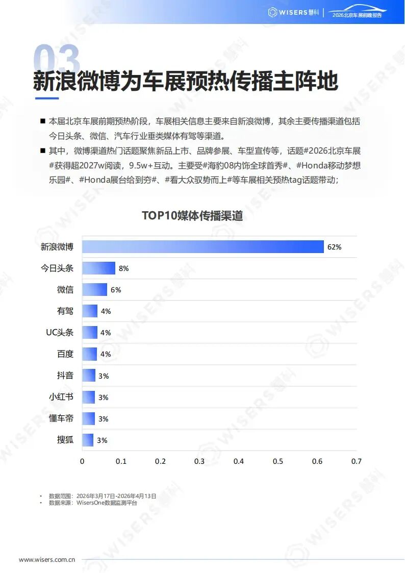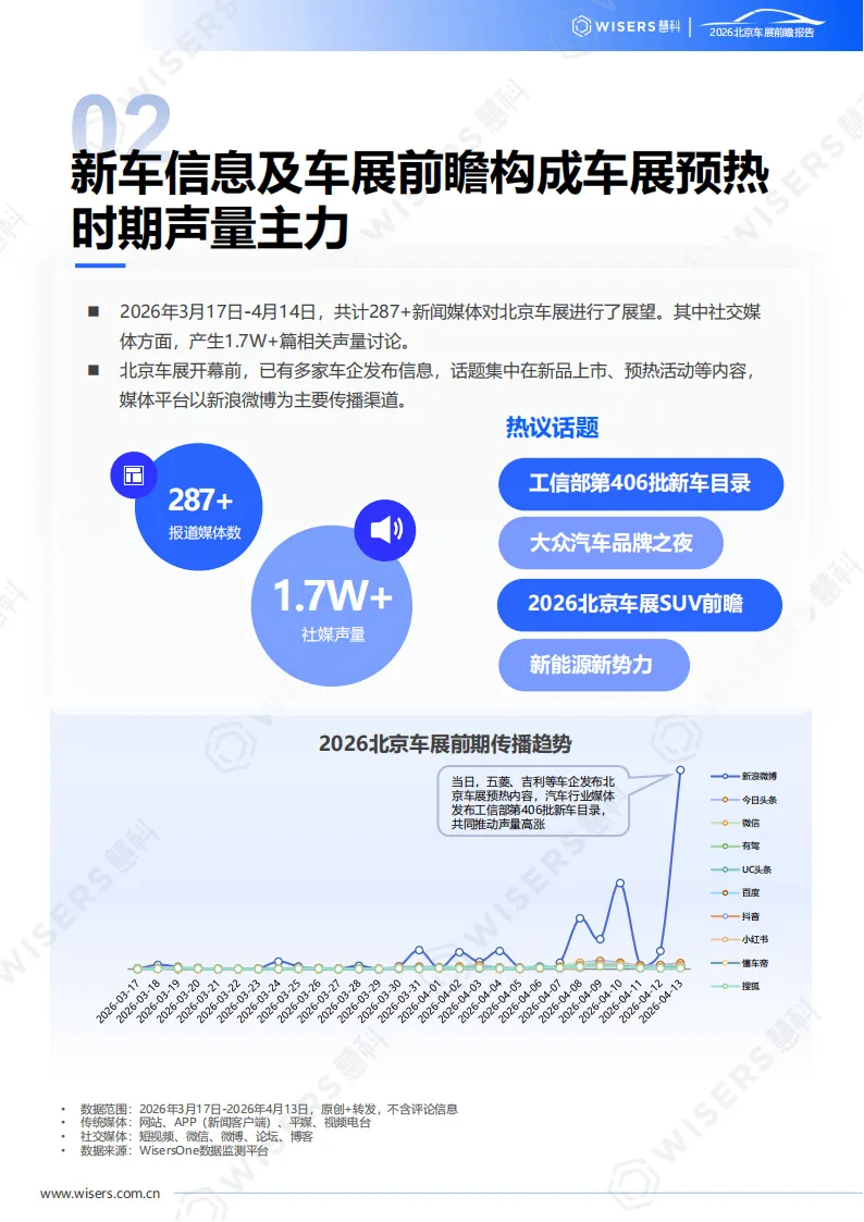 2026年北京国际车展将于4月24日至5月3日举办,以“领时代,智未来”为主题,汇聚2000余家上下游展商,展出面积近38万平方米,预计吸引超90万人次观展,是全球汽车行业聚焦智能化、电动化发展的重要平台。车展预热阶段传播热度高涨,超280家媒体跟进报道,社交媒体相关声量超1.7万条,新浪微博为核心传播渠道,整体舆论以正面为主。