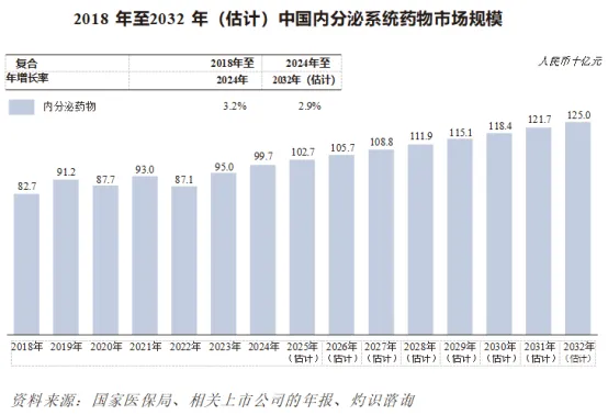 2024年,中国约有167.4百万人受内分泌系统疾病的影响,预计到2032年,有关数字将增加至179.8百万人。按销售收益计算,中国内分泌系统疾病药物的市场规模由2018年的人民币827亿元上升至2024年的人民币997亿元,复合年增长率为3.2%,预计到2032年将上升至人民币1,250亿元,复合年增长率为2.9%。