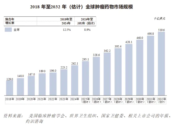 按销售收益计,全球肿瘤药物市场由2018年的1,290亿美元快速增长至2024年的2,621亿美元,复合年增长率达12.5%,预计至2032年将达到5,196亿美元,预测复合年增长率达8.9%。