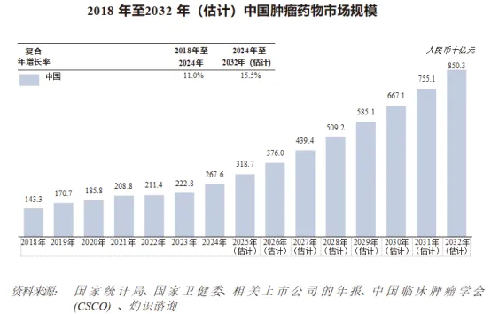 自2018年至2024年,按销售收益计,中国肿瘤药物市场稳步扩张,由2018年的人民币1,433亿元增加至2024年的人民币2,676亿元,复合年增长率达11.0%。预计至2032年将达到人民币8,503亿元,复合年增长率达到惊人的15.5%。