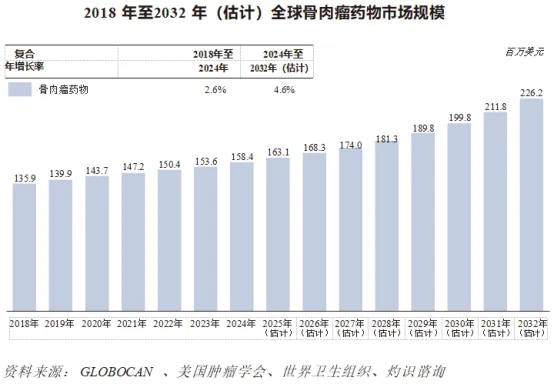 按销售收益计,全球骨肉瘤药物的市场规模由2018年的135.9百万美元增至2024年的158.4百万美元,复合年增长率为2.6%,预计至2032年将增至226.2百万美元,复合年增长率为4.6%。