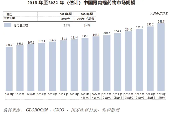 2018年至2024年,中国骨肉瘤癌药物市场稳步增长,由人民币158.3百万元增至人民币185.4百万元,复合年增长率为2.7%,因除传统化疗外缺乏有效的专门治疗方法。然而,随着临床试验活动激增以及近年陆续出现为患者带来曙光的在研药物,预计市场前景将持续改善。以销售收益计,骨肉瘤药物市场规模预计将增长至2032年的人民币241.8百万元,复合年增长率为3.4%。进行中的临床试验数量不断增加,其中若干药物显示出巨大的临床潜力。预计未来增长亦将由新疗法可能陆续获批所推动,预计在2025年至2030年间,该等疗法可能为骨肉瘤患者提供更佳的治疗选择。