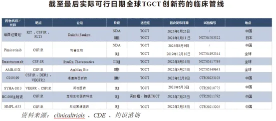 近年来,用于治疗TGCT的创新药在中国的发展势头强劲,从CDE注册在研药物数量的增幅可见一斑。该等新兴疗法专注于新的靶点,旨在解决这种罕见但使人体衰弱的疾病中尚未满足的高医疗需求。下表载列截至最后实际可行日期全球TGCT创新药的临床管线。
