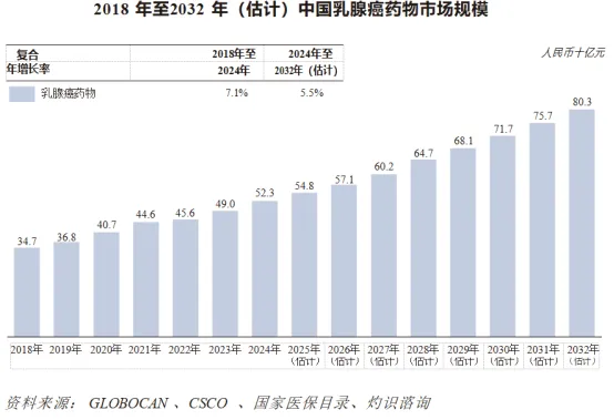 自2018年至2024年,按销售收益计,中国乳腺癌药物市场稳步增长,由2018年的人民币347亿元增至2024年的人民币523亿元,复合年增长率为7.1%。预计增长趋势将会持续,按销售收益计,市场规模将于2032年达到人民币803亿元,复合年增长率为5.5%。