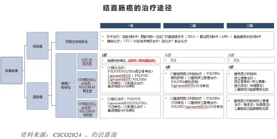 在中国,因早期症状不明显,CRC患者发现症状一般已为晚期,CRC发展至晚期会出现更明显的症状,如便血、腹部肿块以及骨盆或下腹持续疼痛。目前针对晚期CRC的治疗策略分为一线、二线及三线治疗,视乎疾病进展及对先前疗法的反应而定。一线疗法一般根据患者的耐受性及疾病的严重程度分为强化及非强化治疗方案。二线疗法适用于已接受奥沙利铂或伊立替康一线治疗的患者。对于已接受奥沙利铂及伊立替康治疗的患者,三线治疗的重点在于延长存活期及改善生活质量。