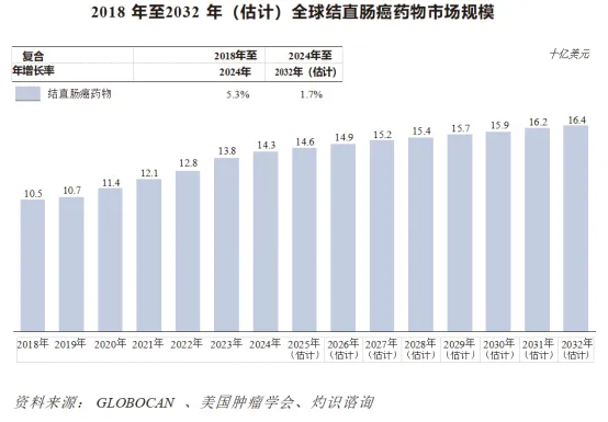 全球结直肠癌药物市场经历快速增长,由2018年的105亿美元增至2024年的143亿美元,复合年增长率为5.3%,预计至2032年将适度增长至164亿美元,复合年增长率为1.7%。