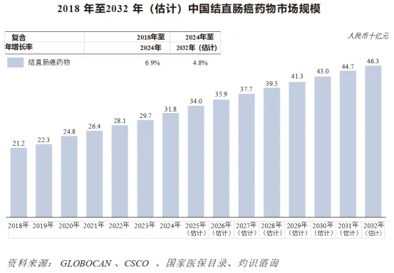 自2018年至2024年,中国的结直肠癌药物市场稳步增长,由2018年的人民币212亿元增至2024年的人民币318亿元,复合年增长率为6.9%,预计至2032年将达到人民币463亿元,复合年增长率为4.8%。