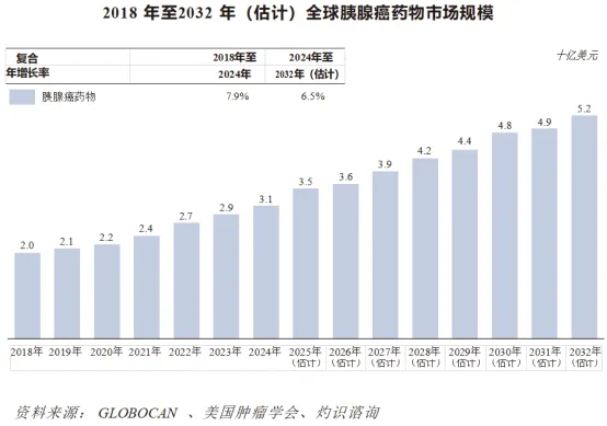 全球胰腺癌药物市场近年经历显着增长,受疾病患病率上升、治疗进步及医疗投资增加所推动,预计将持续扩大。按销售收益计,全球胰腺癌市场的规模由2018年的20亿美元增长至2024年的31亿美元,复合年增长率为7.9%,预计至2032年将达到52亿美元,复合年增长率为6.5%。
