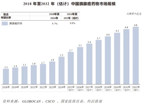 中国胰腺癌药物市场持续强劲增长。按销售收益计,市场规模由2018年的人民币13亿元增至2024年的人民币23亿元,复合年增长率为9.7%,预计至2032年将达到人民币48亿元,复合年增长率升至9.8%。