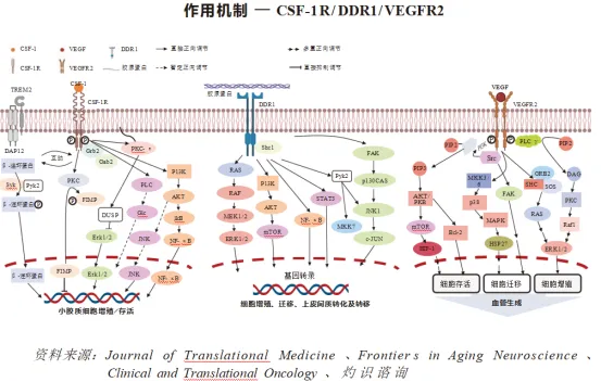 CSF-1R的激活需要其配体(CSF-1或IL-34)的结合,从而导致受体二聚化及随后的信号传导。通过小分子酪氨酸激酶抑制剂或单克隆抗体(mAbs)阻断CSF-1R信号通路,可以有效防止配体结合,抑制TAM的增殖、分化及存活。TAM活性减少会降低肿瘤微环境中的免疫抑制作用,可能增强对癌细胞的整体免疫反应。