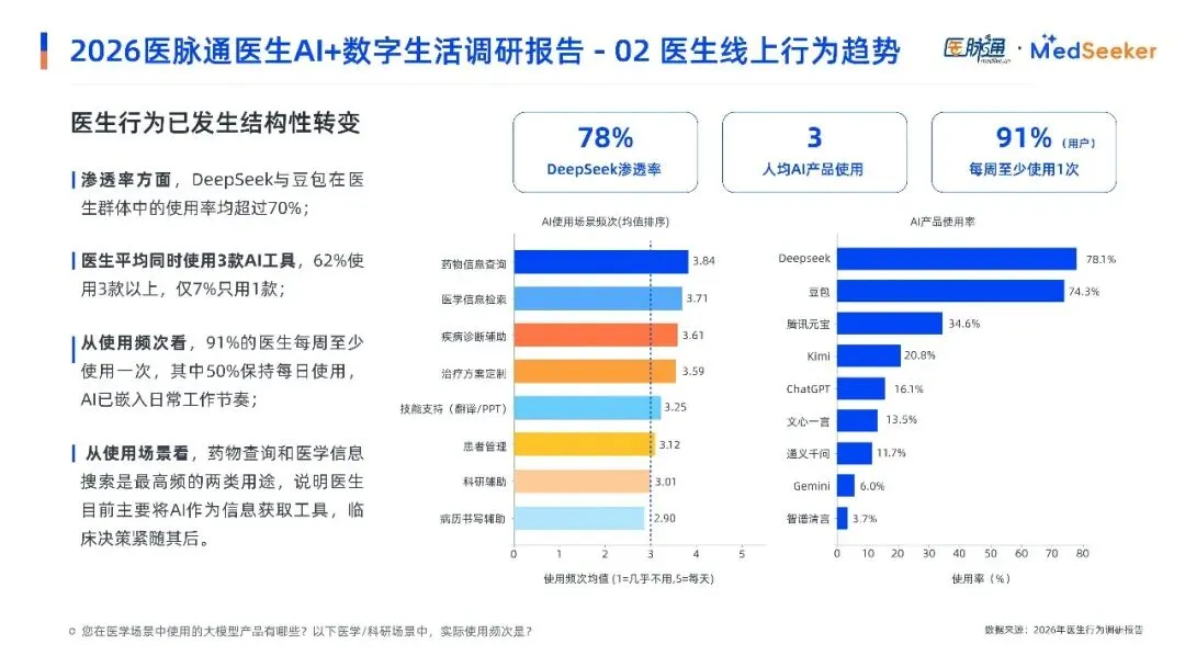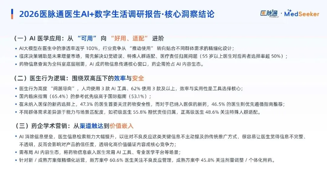 AI大模型在医生中的渗透率近乎 100%,行业竞争从 “推动使用” 转向贴合不同群体需求的精细化设计;