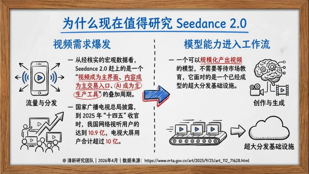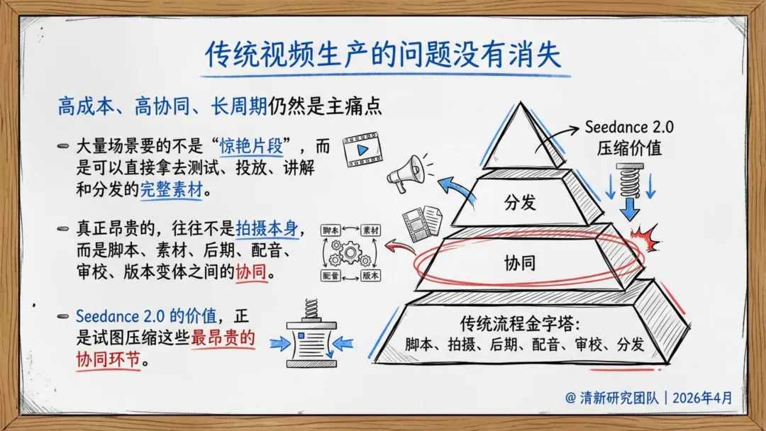 Seedance 2.0 的意义在于把视频生成从工具变成系统。真正的壁垒不再是模型效果,而是素材资产化 + 语义模板化 + 合规流程化三位一体的基础设施。竞争焦点正从模型能力转向系统能力。