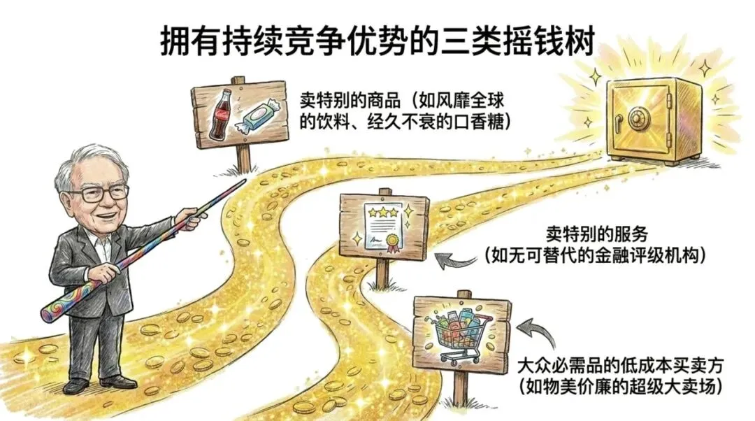 什么样的公司能成为持续下金蛋的摇钱树?它们通常具备三种无可匹敌的竞争优势。第一种是卖特别的商品,比如风靡全球的神秘饮料或是经久不衰的口香糖,消费者对它们有瘾。第二种是卖特别的服务,比如无可替代的金融评级机构,它们掌控着行业的通行证。第三种则是大众必需品的低成本买卖方,比如物美价廉的超级大卖场,靠极致的规模碾压对手。