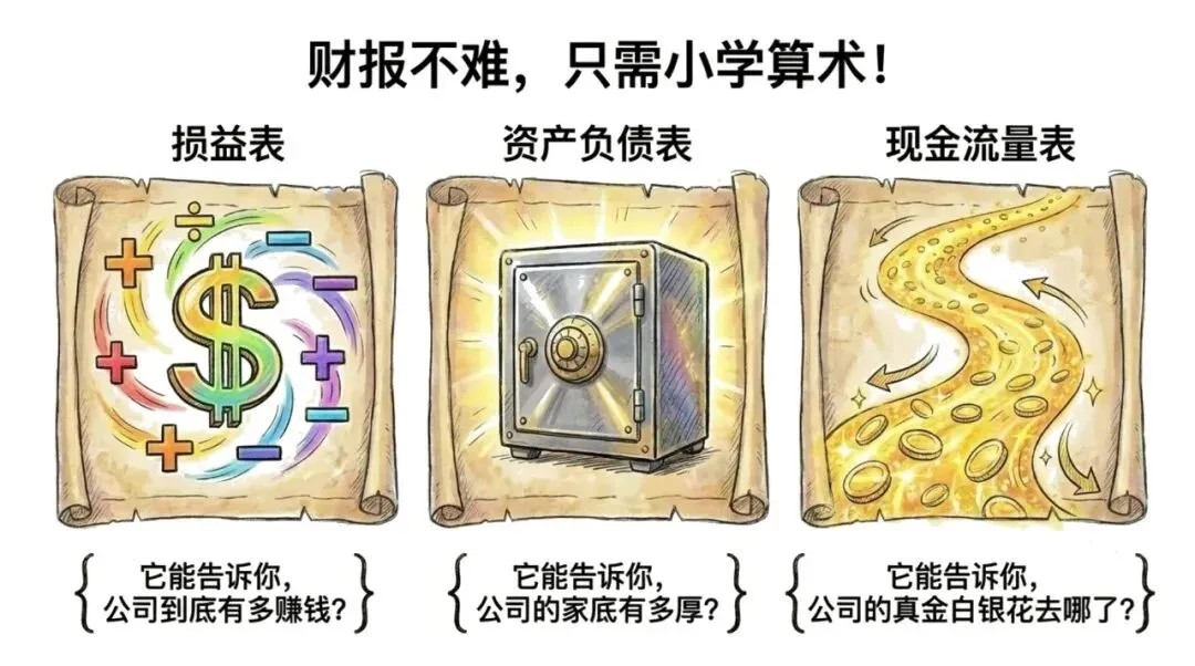 别被华尔街的术语吓倒,读财报真的只需要小学算术。三张表构成了公司的全貌:损益表告诉你这家公司到底有多赚钱,是不是一台高效的印钞机;资产负债表为你掀开公司的底牌,看看它的家底到底有多厚,能不能扛住寒冬;而现金流量表最诚实,它会精准追踪公司的真金白银究竟花到哪里去了。