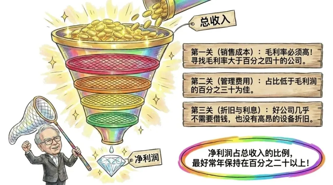 净利润不是天上掉下来的,它需要经过三道严苛的筛选。第一关是毛利率,必须常年大于40%,这代表公司拥有强大的定价权。第二关是管理费用,占比最好低于毛利润的30%,说明公司运转极其高效。第三关是折旧与利息,真正的好公司几乎不需要借钱,也不用花大价钱维护昂贵的设备。层层过滤后,净利润占总收入的比例若能常年保持在20%以上,这就是真正的钻石企业。