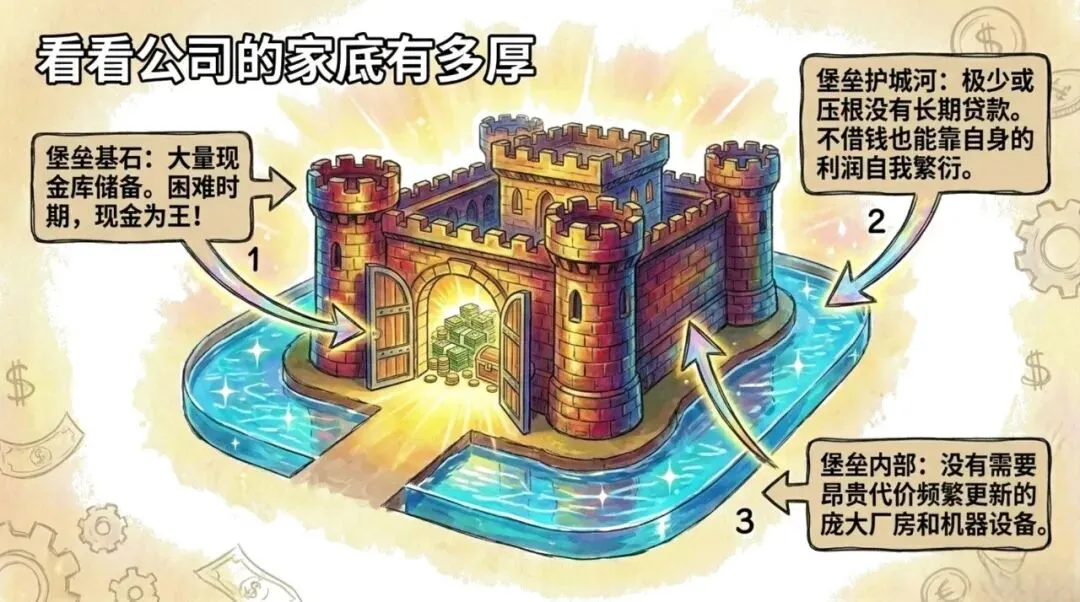 一家超级公司必须拥有抗击任何经济危机的堡垒。它的基石是大量的现金储备,因为在困难时期,现金就是绝对的王牌。它的护城河是极少甚至压根没有长期贷款,哪怕一分钱不借,也能靠自身产生的利润自我繁衍。而在这座堡垒内部,你绝对看不到那些需要付出昂贵代价去频繁更新换代的庞大厂房和机器设备。