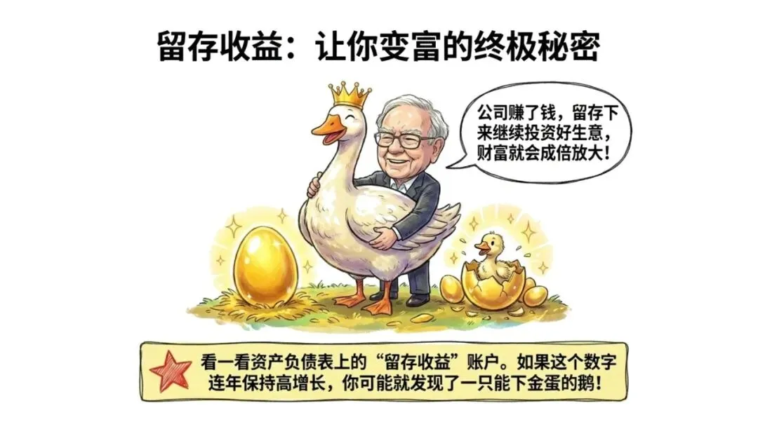 资产负债表上有一个最容易被忽视,却最为神奇的账户——留存收益。当公司赚了钱,它没有把利润全部分掉,而是留存下来继续投入到这个极具优势的好生意中,财富就会以惊人的速度成倍放大。如果你发现这个数字连年保持着高增长,恭喜你,你很可能发现了一只真正能源源不断下金蛋的鹅。