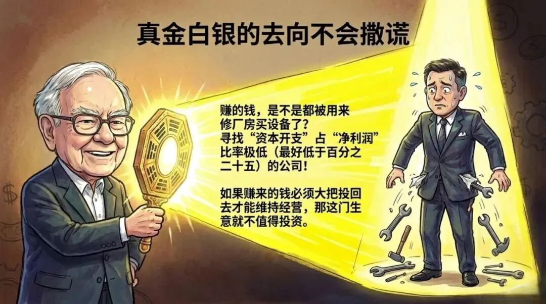 赚来的钱,到底去哪了?有些公司表面利润光鲜,但赚来的钱全都被迫用来修新厂房、买新设备了,这叫“虚假繁荣”。我们要寻找的是“资本开支”占“净利润”比率极低的公司,这个比例最好常年低于25%。如果一家公司赚来的钱必须大把大把地投回去才能勉强维持现有经营,那这门生意就毫无投资价值。