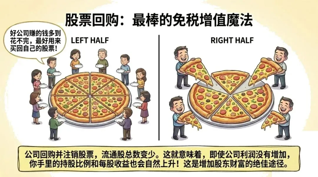 好公司赚的钱实在太多,多到根本花不完。这时候最明智的做法是什么?不是盲目跨界扩张,而是买回自己的股票并注销!这就好比分披萨的人少了,即使披萨的尺寸没有变大,你手里分到的那一角也会自然变大。流通股减少,意味着你的持股比例和每股收益自动上升,这是增加股东财富最直接、绝佳的免税途径。
