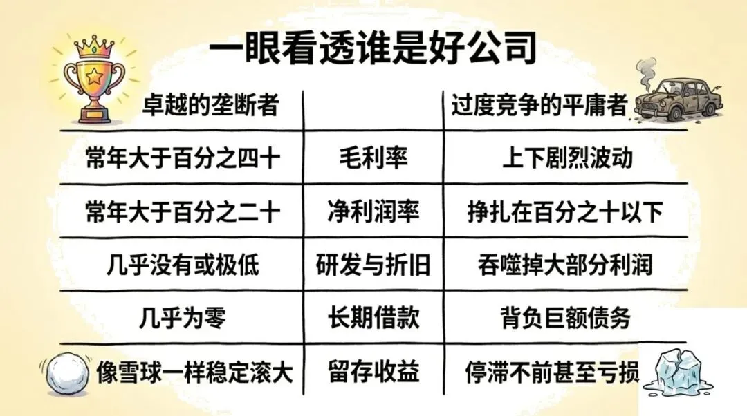 好公司与烂公司的区别,在财报上黑白分明。卓越的垄断者毛利率常年大于40%,净利润率大于20%,几乎没有长期借款,留存收益像雪球一样越滚越大。而那些过度竞争的平庸者,毛利率上下剧烈波动,净利润率挣扎在10%以下,研发和折旧吞噬了大部分利润,背负巨额债务,留存收益停滞不前甚至亏损。 “平庸的公司在财报里挣扎,卓越的公司在财报里印钞。”