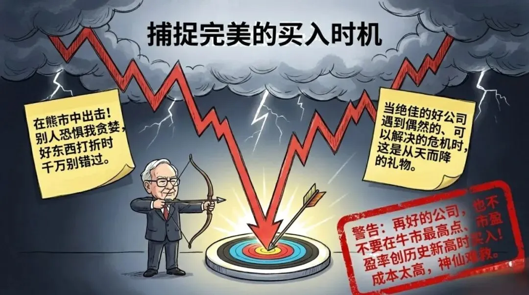 别人恐惧我贪婪!当绝佳的好公司遇到偶然的、可以被解决的危机时,或者遭遇股市大熊市导致股价被错杀时,这就是从天而降的礼物,千万别错过打折的极品。但是,必须牢记一个致命警告:再好的公司,也绝对不要在牛市最高点、市盈率创历史新高时买入!买入成本一旦过高,神仙也救不了你。