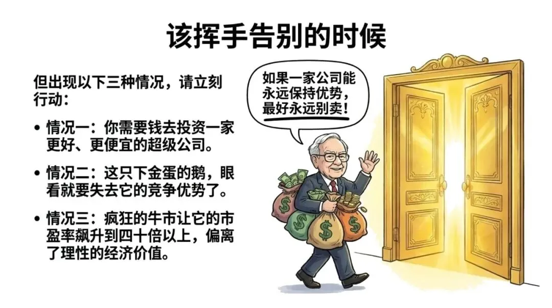 如果一家公司能永远保持竞争优势,最好的策略是永远别卖。但在三种特定情况下,你必须立刻行动、挥手告别:第一,你发现了更好、更便宜的超级公司,需要腾出资金;第二,这只下金蛋的鹅核心护城河被打破,眼看就要失去竞争优势;第三,市场极度狂热,疯牛市让它的市盈率飙升到40倍以上,价格已经完全偏离了理性的经济价值。