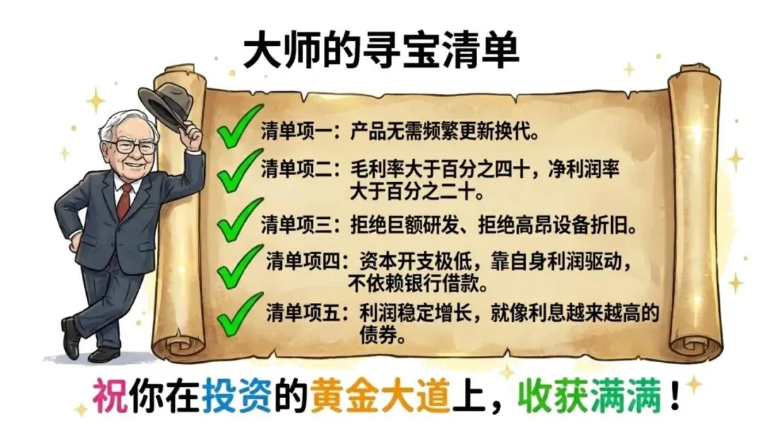 将复杂的逻辑浓缩为五条铁律:首先,产品无需频繁更新换代;其次,毛利率大于40%,净利润率大于20%;第三,拒绝巨额研发和高昂设备折旧;第四,资本开支极低,靠自身利润驱动,绝不依赖银行借款;最后,利润能稳定增长,就像一张利息越来越高的超级债券。拿着这张清单,祝你在投资的黄金大道上收获满满!