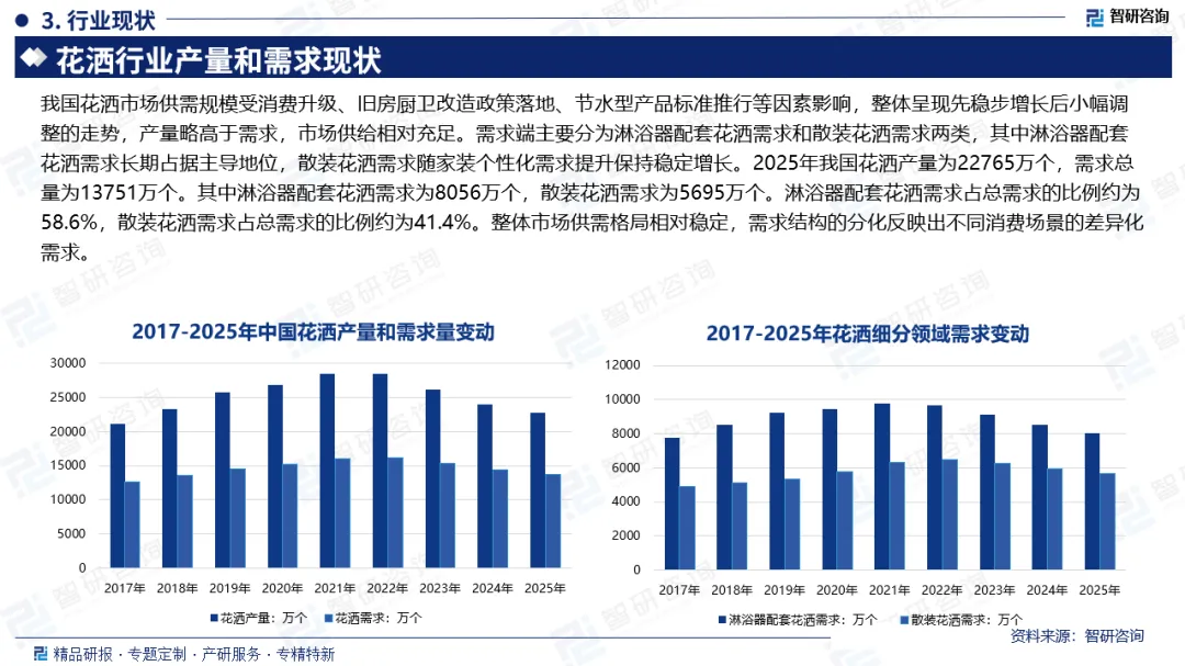 供需及细分:我国花洒市场供需规模受消费升级、旧房厨卫改造政策落地、节水型产品标准推行等因素影响,整体呈现先稳步增长后小幅调整的走势。2025年我国花洒产量为22765万个,需求总量为13751万个。2025年我国淋浴器配套花洒需求为8056万个,散装花洒需求为5695万个。淋浴器配套花洒需求占总需求的比例约为58.6%,散装花洒需求占总需求的比例约为41.4%。整体市场供需格局相对稳定,需求结构的分化反映出不同消费场景的差异化需求。
