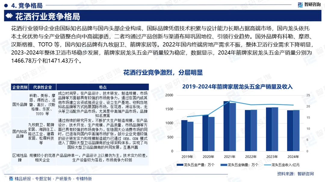 市场趋势:消费升级与居民卫浴体验高要求推动花洒产品持续升级,企业加大研发融合节水、智能等技术推出多功能产品,设计贴合多元家装风格,中高端产品占比提升带动行业均价稳升,技术迭代和场景化创新推动行业从价格竞争转向价值竞争;国内头部企业也依托技术与规模优势加速自有品牌出海,行业集中度提升,头部企业通过并购合作整合产业链、参与国际标准制定,全球化布局与产业整合成为突破国内市场瓶颈的核心路径。