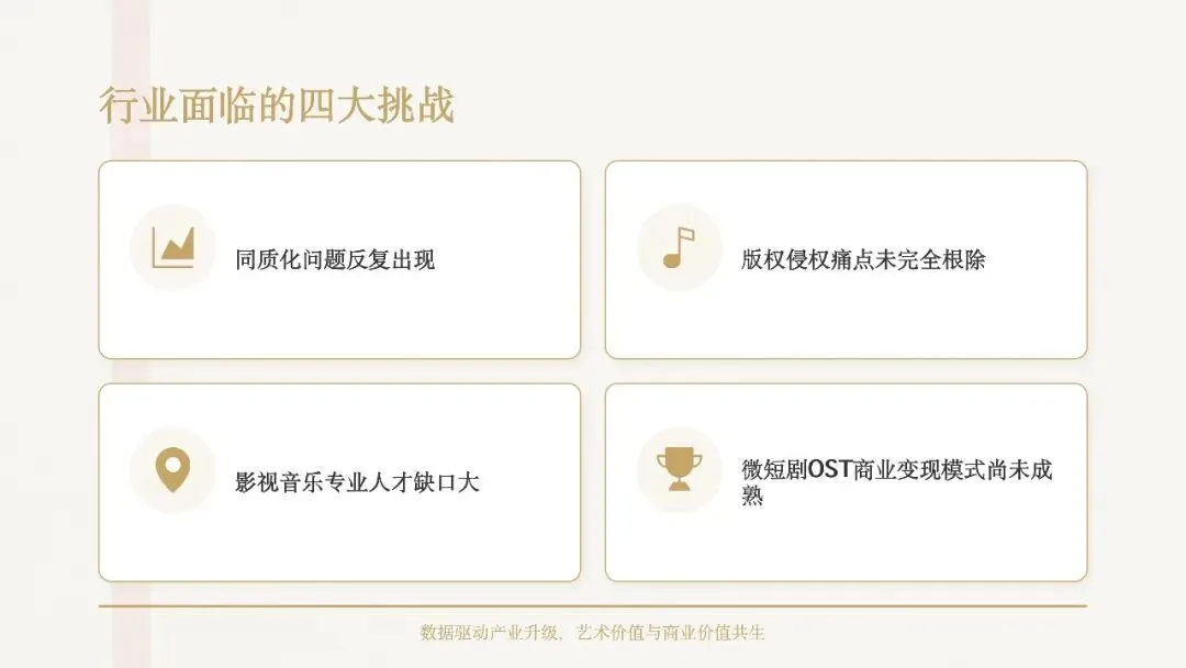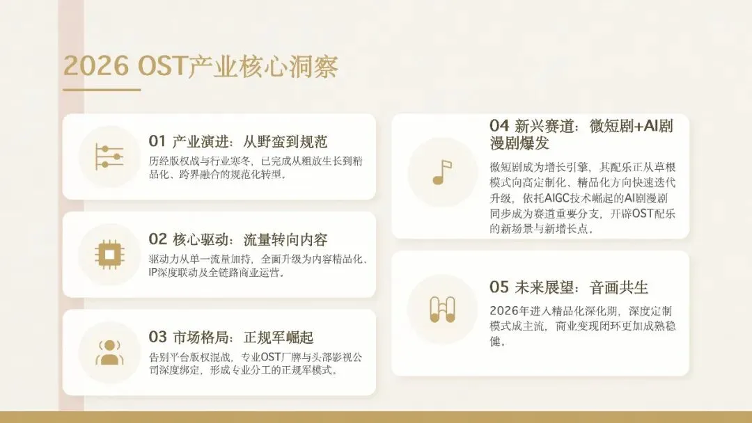 “本报告系统梳理了2020至2026年间国内影视OST产业从“产业赋能”到“价值核心”的跃迁路径。报告基于行业公开数据,全景回顾了版权割据、全链路变现、精品化穿越周期、现象级出圈、跨界融合等关键节点,并重点关注微短剧崛起、AI剧漫剧爆发、深度定制与商业闭环成型等产业核心趋势。报告指出,OST已从影视附属品升级为独立商业资产,行业正迈入精品化、标准化、多元变现的高质量发展阶段。”