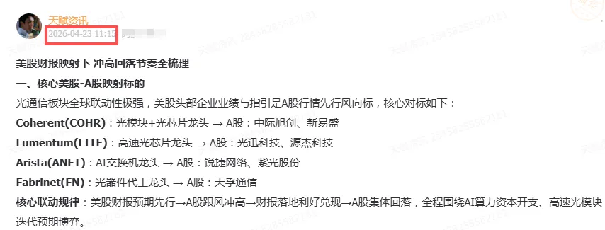 核心联动规律:美股财报预期先行→A股跟风冲高→财报落地利好兑现→A股集体回落,全程围绕AI算力资本开支、高速光模块迭代预期博弈。