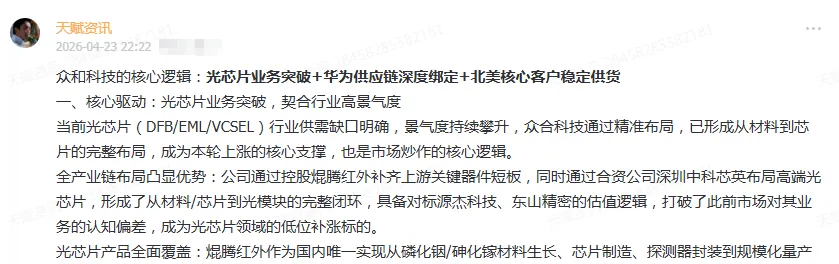 •短期(4月底-5月初):临近51长假,且中东局势谈判缓和临近,警惕财报落地后的冲高回落,规避高位兑现风险;可以确定短期主升浪已结束,EML光芯片、磷化铟晶片衬底外延片等核心物料也是震荡机会。