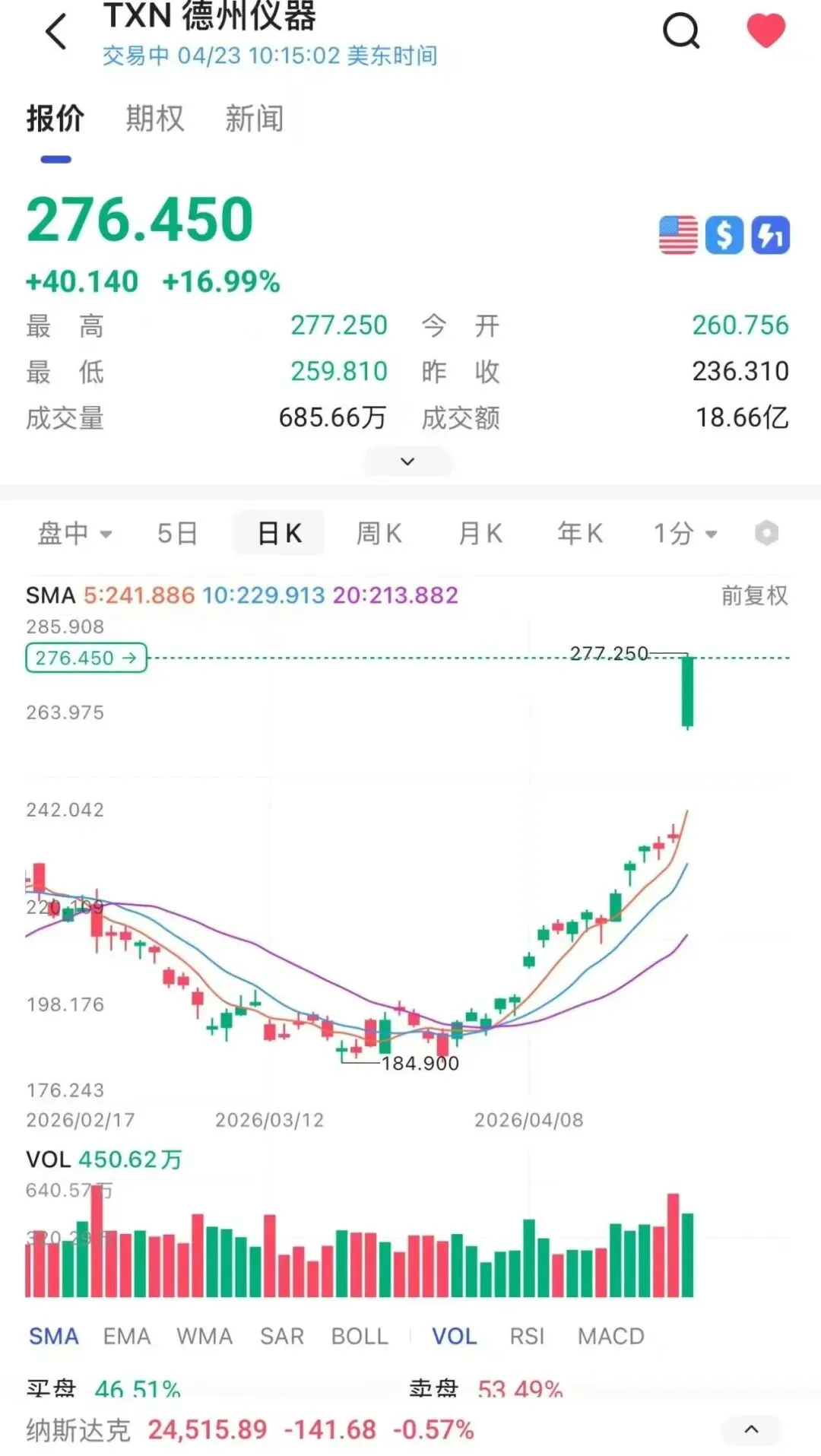 TI股价大涨17.83%,创近年最大单日涨幅。