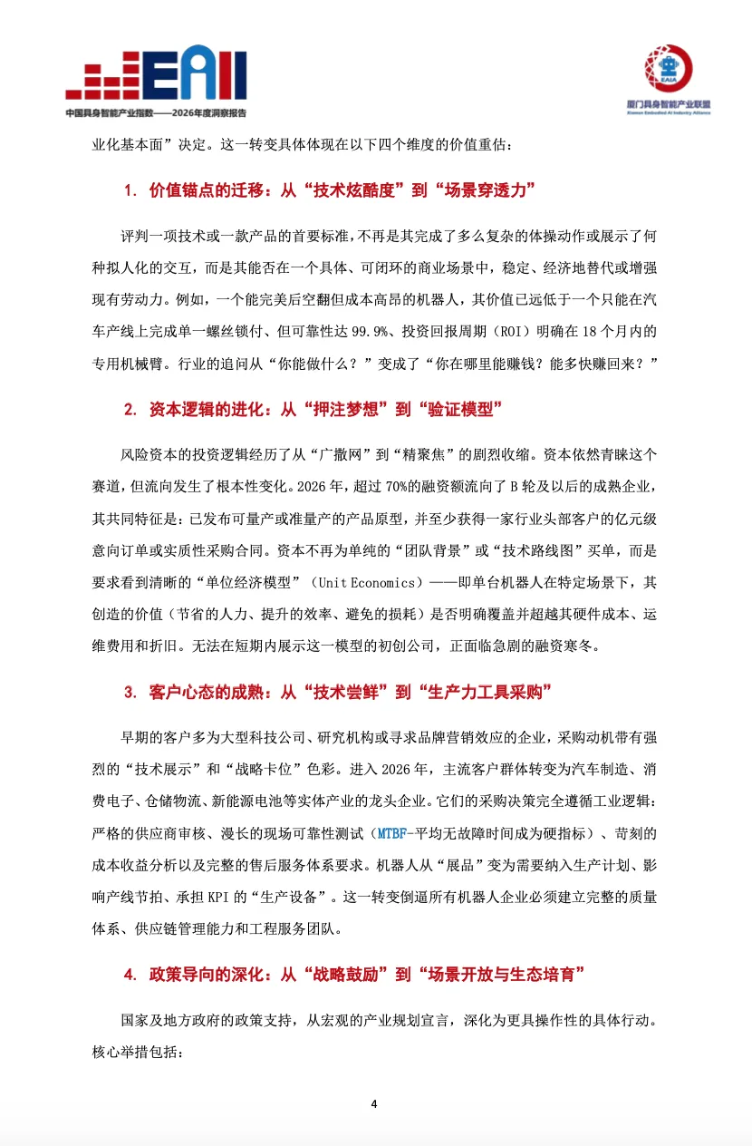 2025 年至 2026 年,是中国#具身智能 产业发展史上具有决定性意义的“分水岭”。产业发展的核心逻辑、价值评估体系、竞争焦点以及社会期待,均发生了深刻且不可逆的转变。本小节旨在深度解构这一历史性转折的宏观图景、内在驱动力与深远影响。
