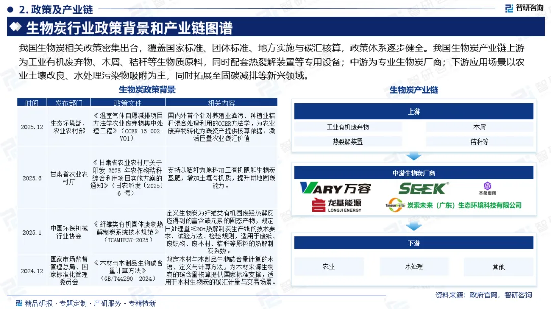 行业政策:我国生物炭相关政策密集出台,覆盖国家标准、团体标准、地方实施与碳汇核算,政策体系逐步健全。《甘肃省农业农村厅关于印发 2025 年农作物秸秆综合利用项目实施方案的通知》《木材与木制品生物碳含量计算方法》