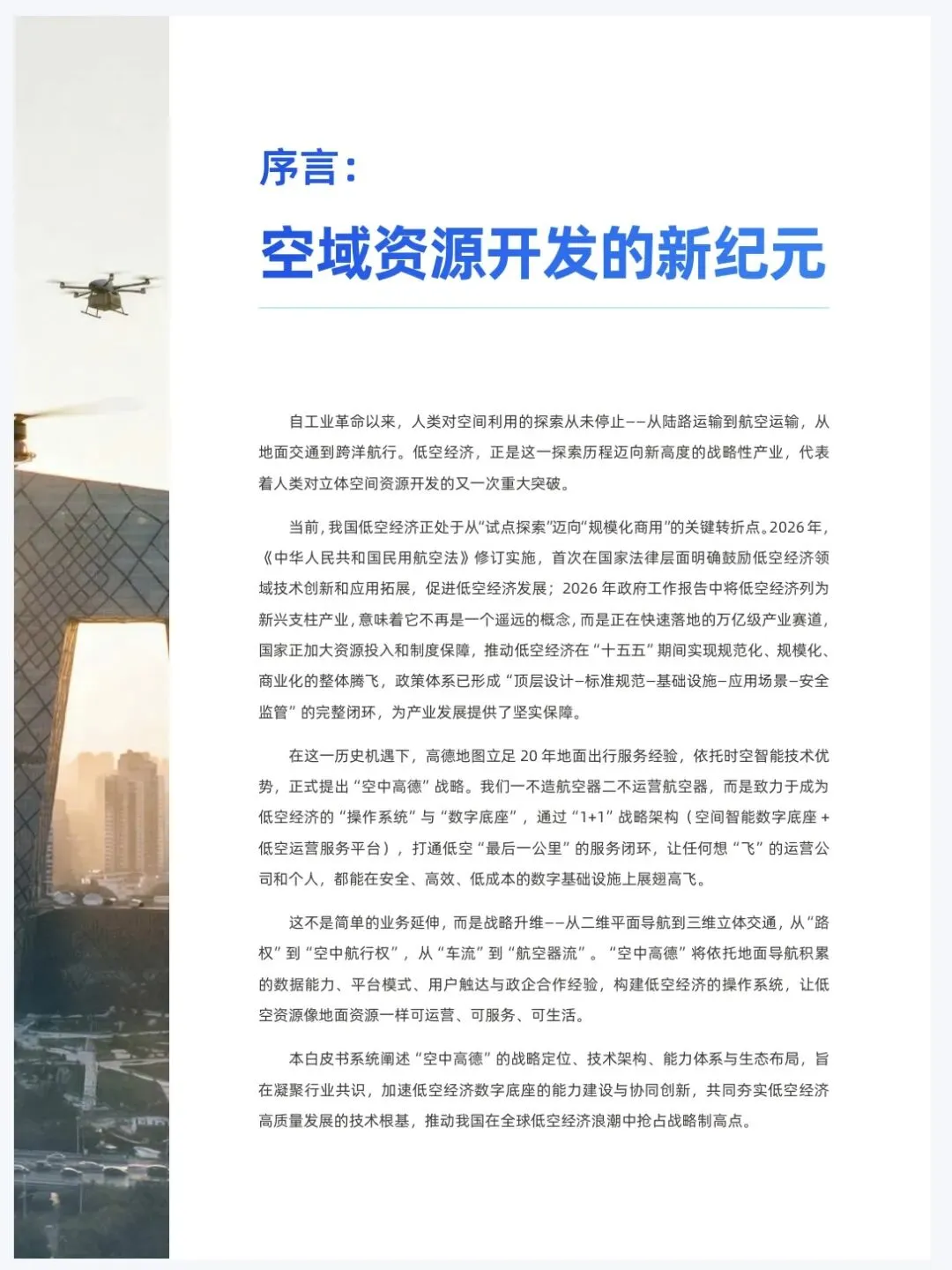 本次白皮书系统阐述了“空中高德”的战略定位、技术架构、能力体系与生态布局,旨在凝聚行业共识,加速低空经济数字底座建设与协同创新,夯实低空经济高质量发展的技术根基,助力我国在全球低空经济竞争中抢占先机。